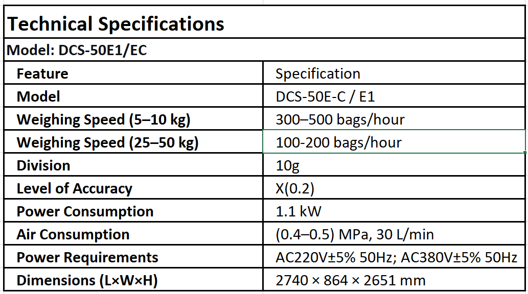 Efficient Performance: Capable of packaging 180 to 450 bags per hour with a high accuracy level of X(0.2).