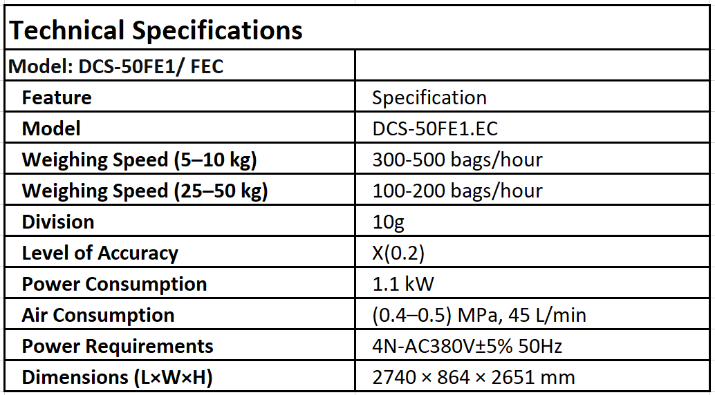 The Ewinmech DCS-50FE-C is a high-precision, automated packaging machine designed for efficiently filling 5-50kg bags. This machine is a high efficiency packing machine suitable for small to medium scale rice factories and for large factories who need to fulfill smaller tasks. It features innovative technology to ensure accuracy, durability, and ease of use in industrial environments. This model uses 3 loadcells/ load sensors to increase the packing speed and accuracy.